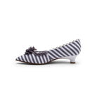 Josephine 18th Century Pumps are the ideal transitional shoe! Josephine is festooned with 100% silk ribbon pleated toe trim and rosettes. This jaunty pump's uppers are constructed in lovely striped cotton, with period-accurate side seams and a cotton twill lining. Featuring a distinctive tapered toe and brand-new, perfectly balanced 1.5"/3.81 cm leather-covered Italian heel, Josephine is a fine fit for your favorite late-18th century impressions and costumes.