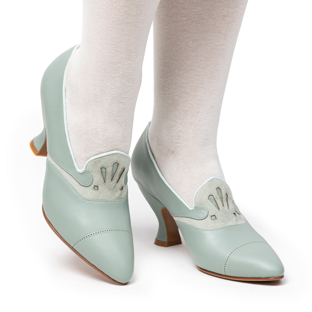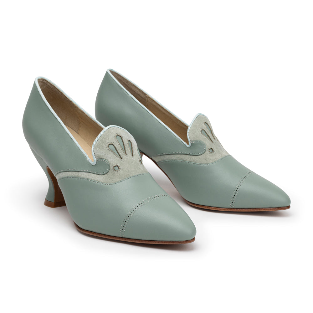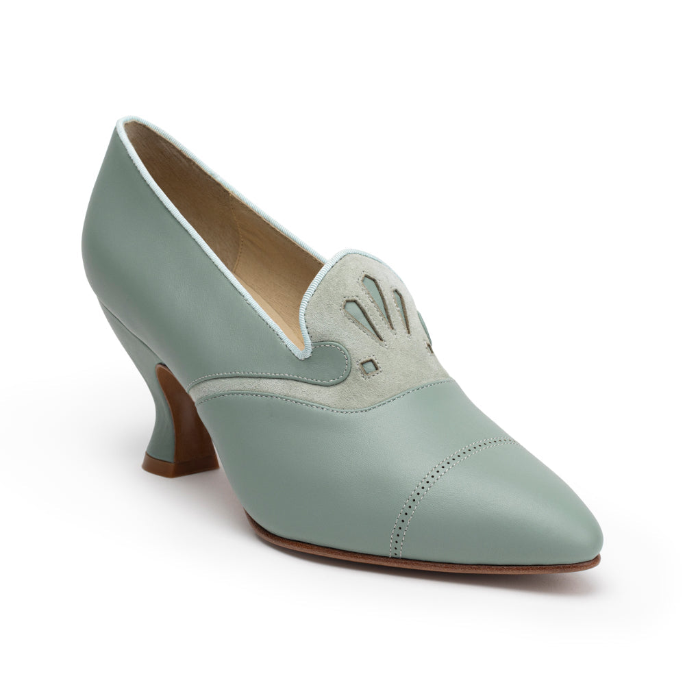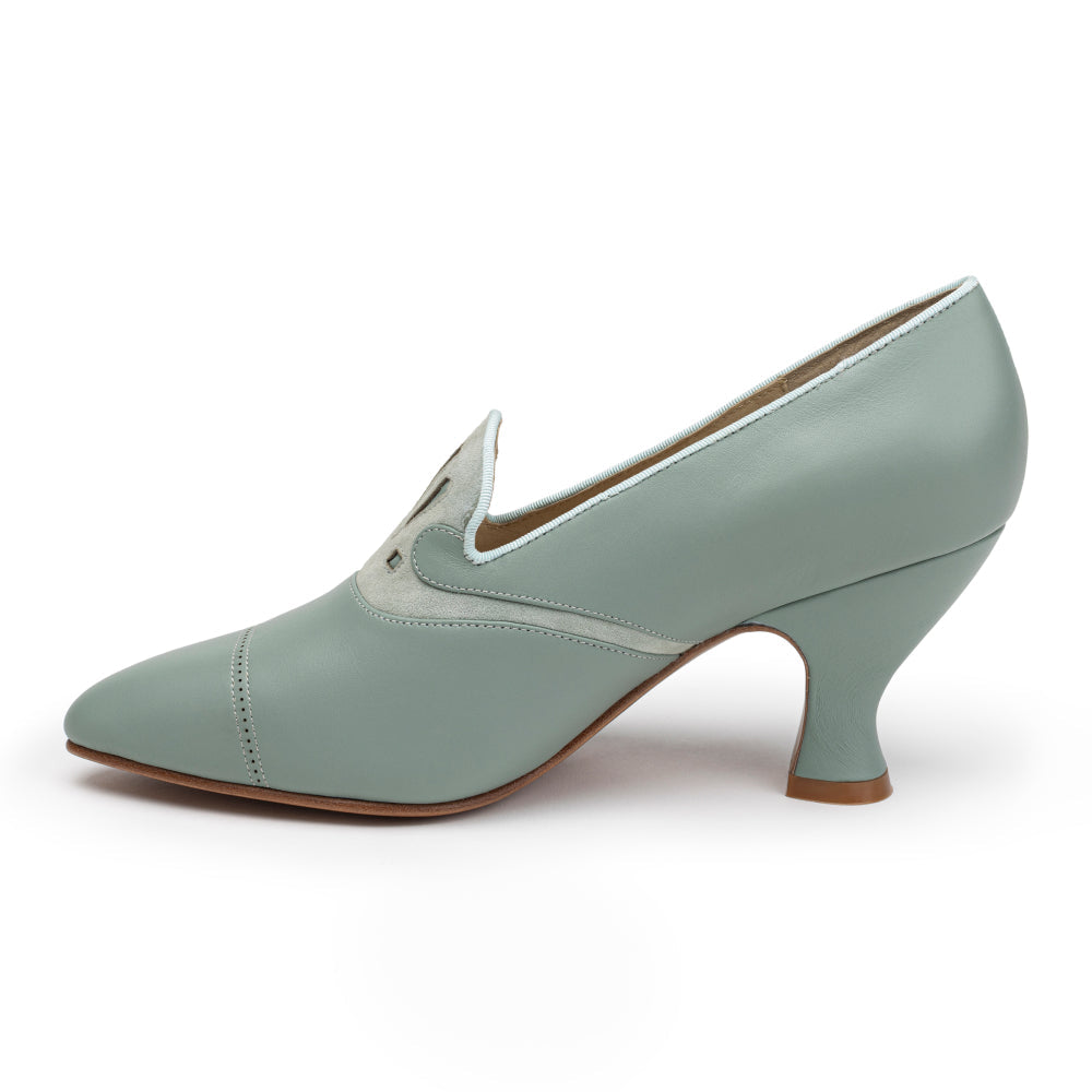 Be utterly beguiling in Elsie Pumps! Meticulously reproduced from period originals, Elsie is accurate to 1890 through 1920. These step-in pumps feature smooth leather and suede uppers in coordinating colors, as well as a distinctive shaped tongue with cutout detailing. Elsie features a custom, perfectly balanced 3”/ 7.6 cm French spool heel, so you can glide across the floor at any soirée. Elsie pairs wonderfully with tea and lingerie gowns as well as evening wear. To keep your Elsies looking spiffy, we recommend pre-treating them with Angelus Water & Stain Repellent.
