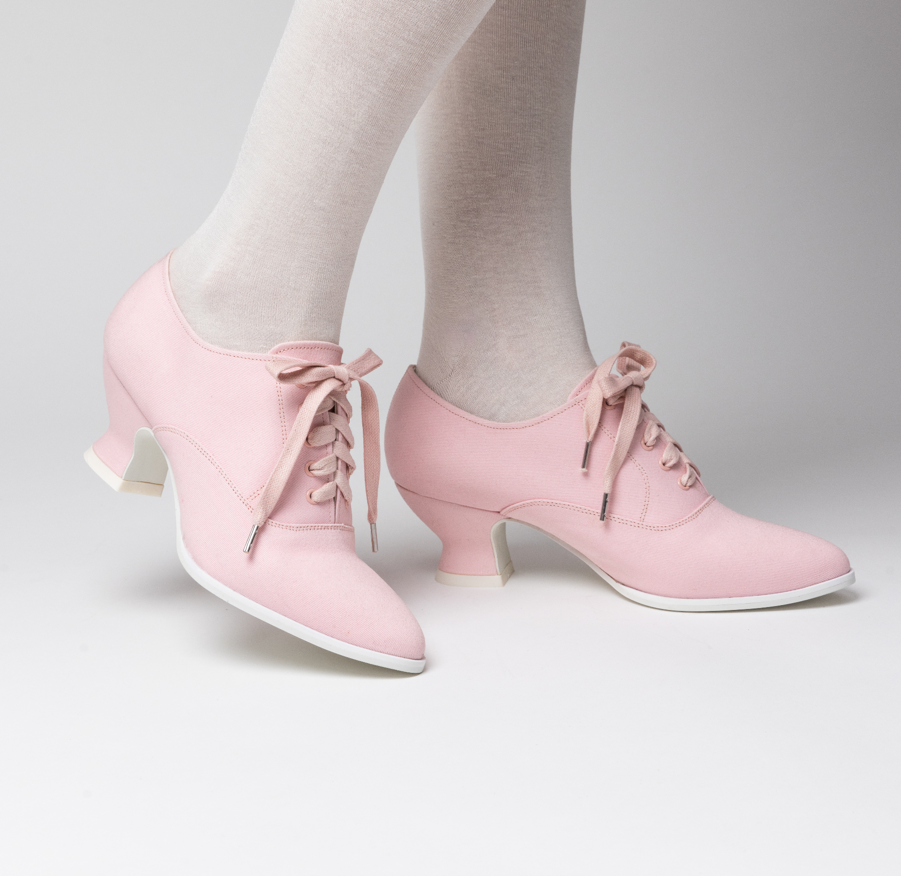 Meet the Kedwardians, the perfect light and breezy sporting shoes from the turn of the 20th century. Based on many original examples of early ladies' tennis shoes, the Kedwardians are made inside and out in cotton canvas paired with practical rubber soles and a stable and comfortable 2 in / 5 cm French heel. These Edwardian tennis shoes are leather-free, lightweight, easy to clean, and extremely comfortable.