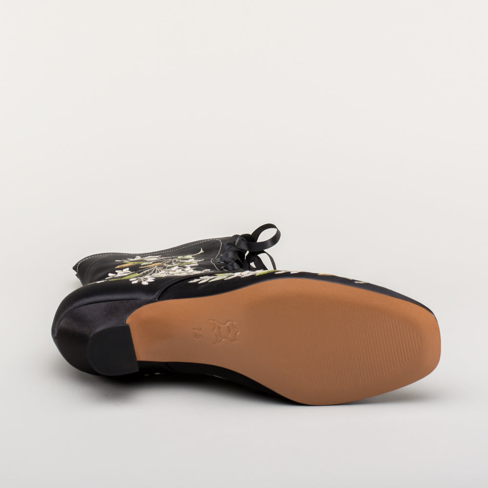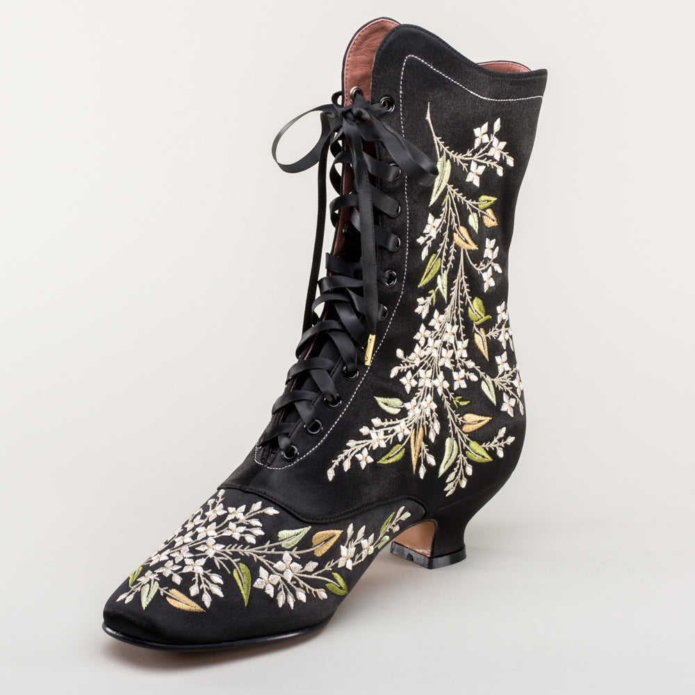 Indulge in a piece of history with Flora Embroidered Boots, an exclusive reproduction of the intricate opera and evening boots popular in the late Victorian period. Expertly crafted with intricate botanical detailing, these stunning satin boots will take you back to an era of sophistication and finesse. Wear them with bustle and Belle Epoque attire from the 1870s to c. 1900, or with modern dress as a statement piece.