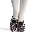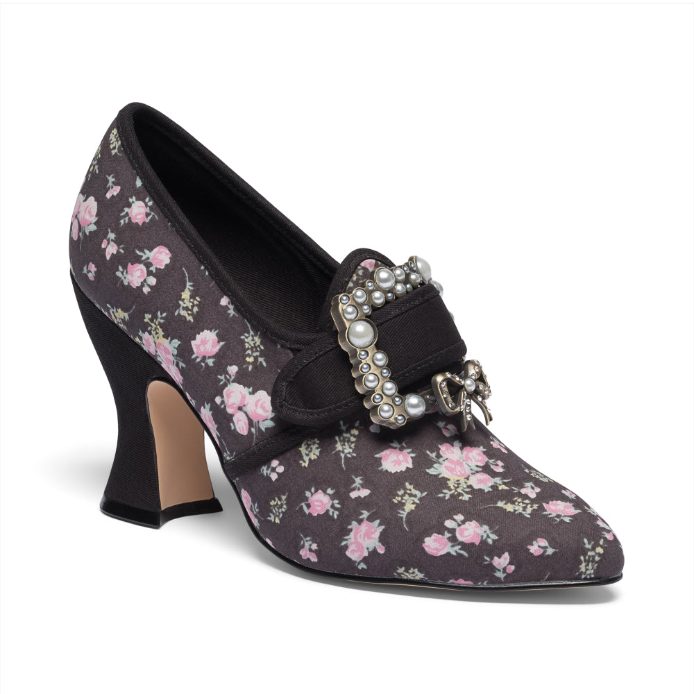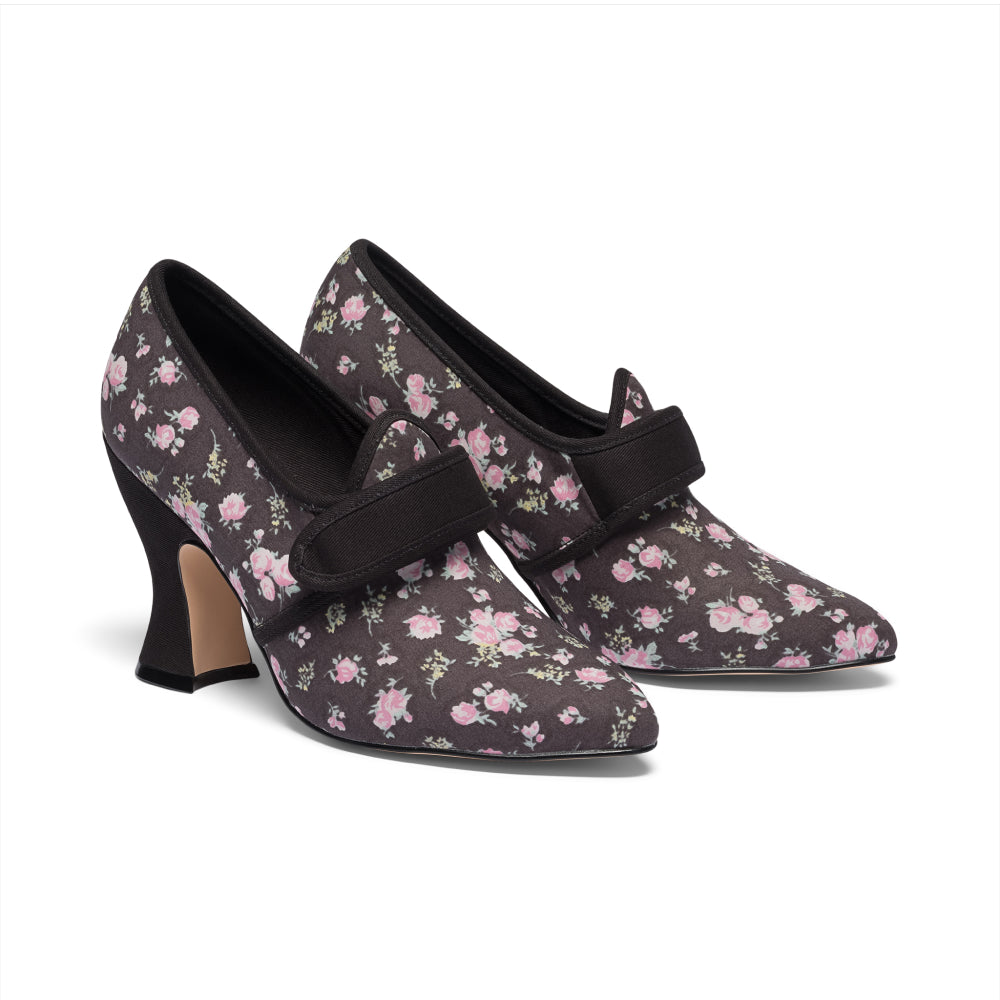 18th-century floral fantasies come to life with the gorgeous Adelaide Latchet Shoes, designed in collaboration with Elena Kanagy-Loux! Named for the 18th-century trailblazing artist Adélaïde Labille-Guiard, these shoes are dramatic, luxurious, and sure to make a statement. This curvaceous confection features 100% cotton uppers in a charming floral print set of by coordinating cotton canvas-covered heels and twill tape binding. Our custom 3.5"/ 7.62 cm French heels are perfectly balanced for comfort. Lined with cotton canvas and finished with a quality rubber sole, Adelaide is entirely leather-free. Adelaide’s 1.10"/28 mm, fully functional floral latchets look especially darling when fastened with matching Pearl Buckles.