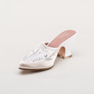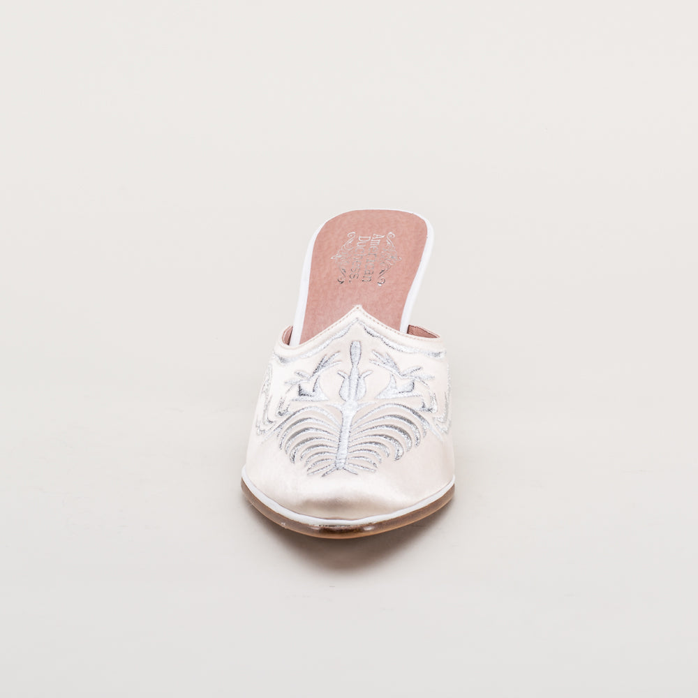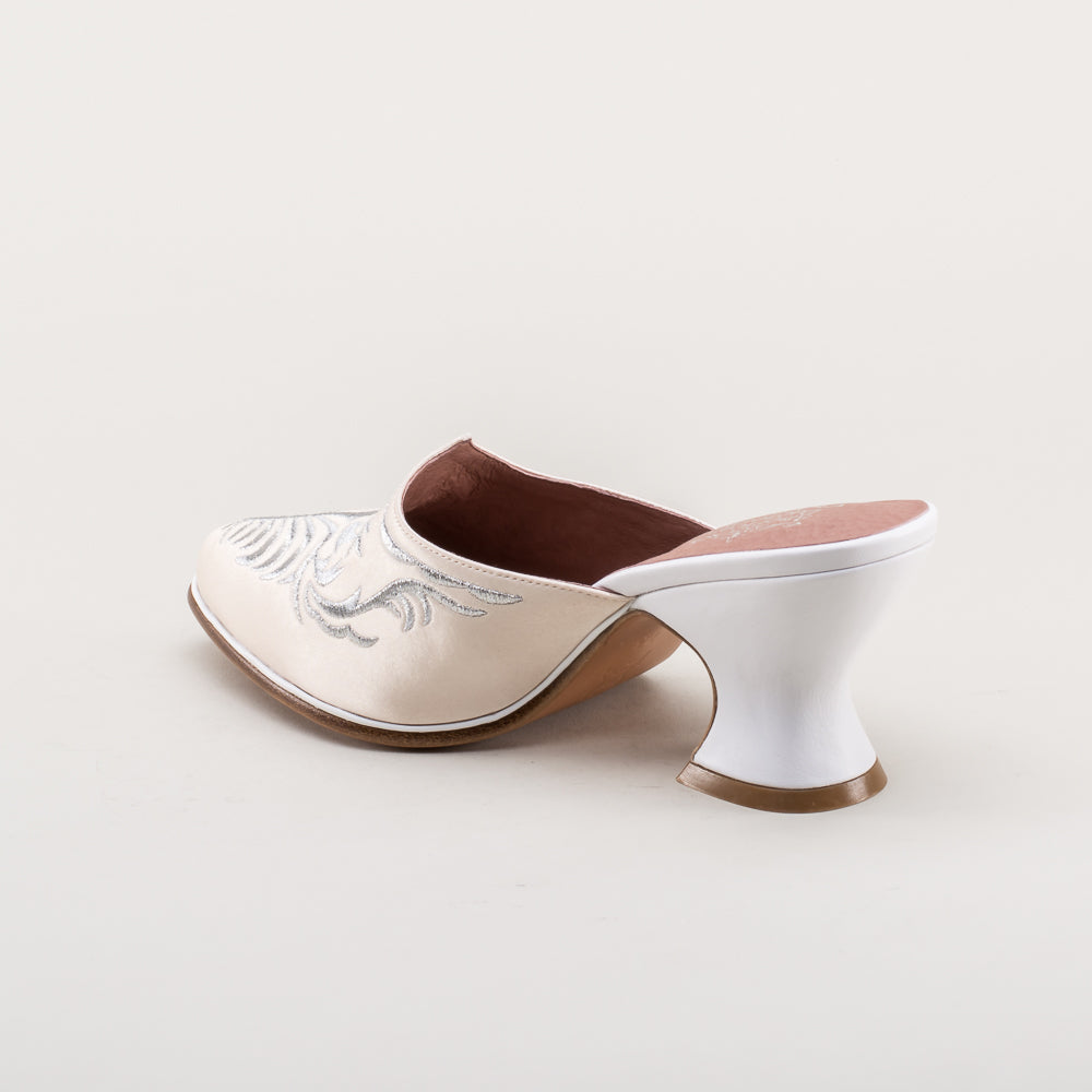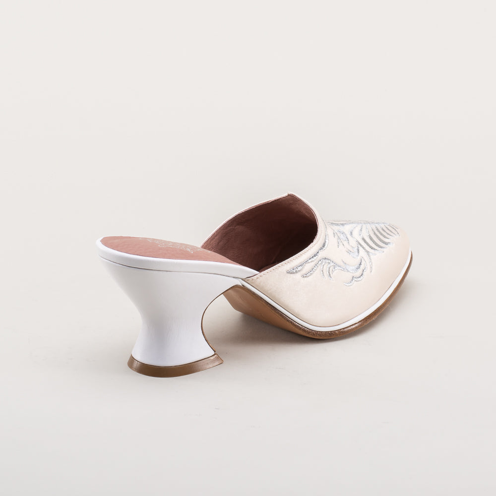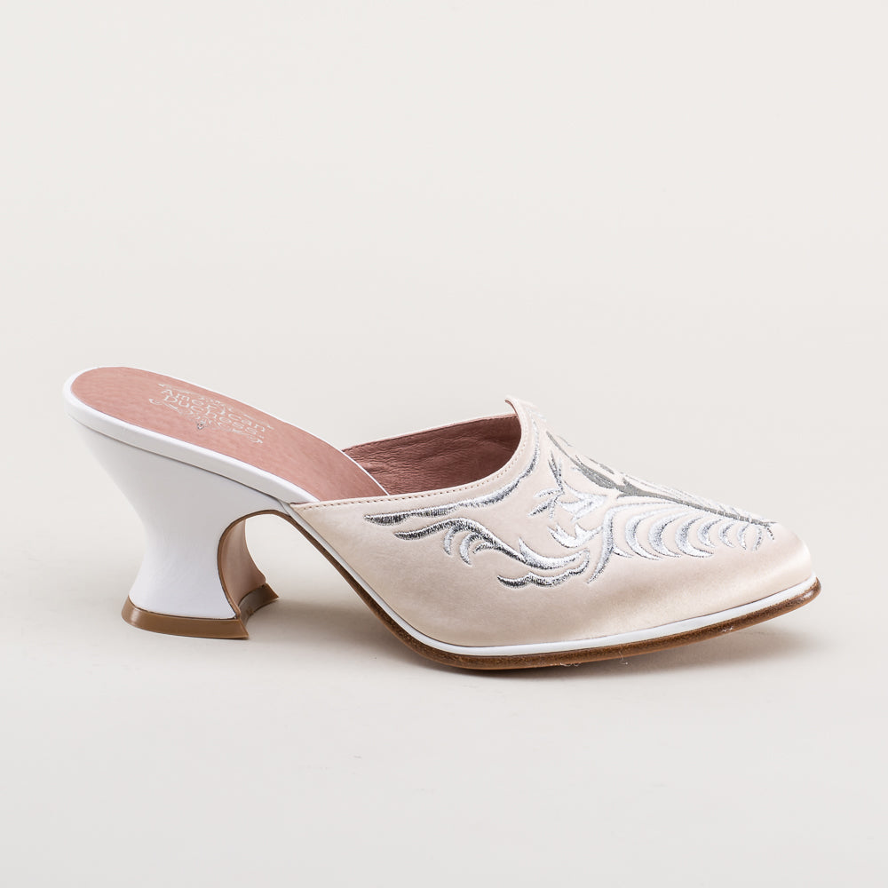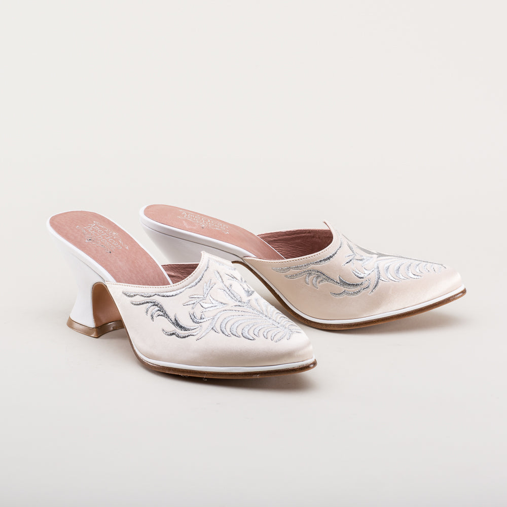 The Antoinette mules are made of durable materials specifically to withstand both indoor and outdoor wear, so don't be afraid of ruining your shoes between carriage and palace. These beautiful slippers are easily slipped on or off when fully dressed - no bending down to fasten buckles or ties - and the real leather lining keeps them securely on your feet.