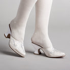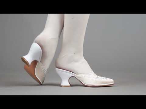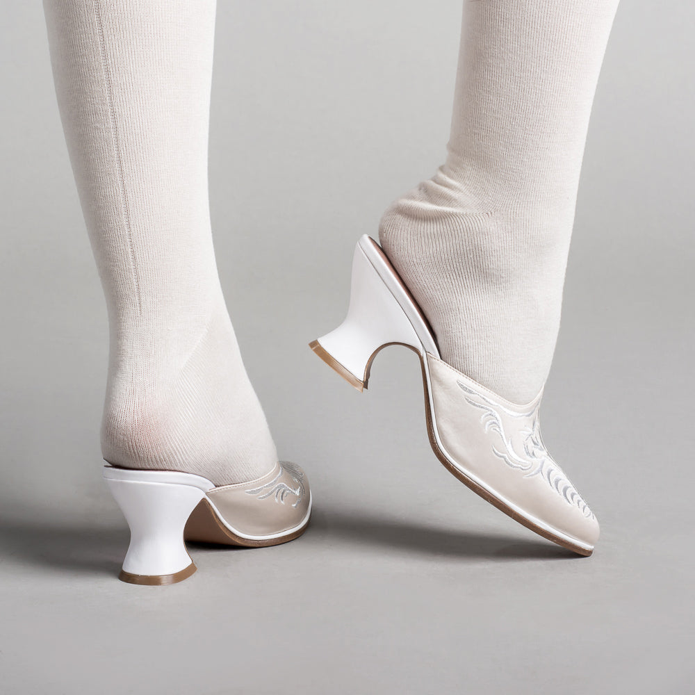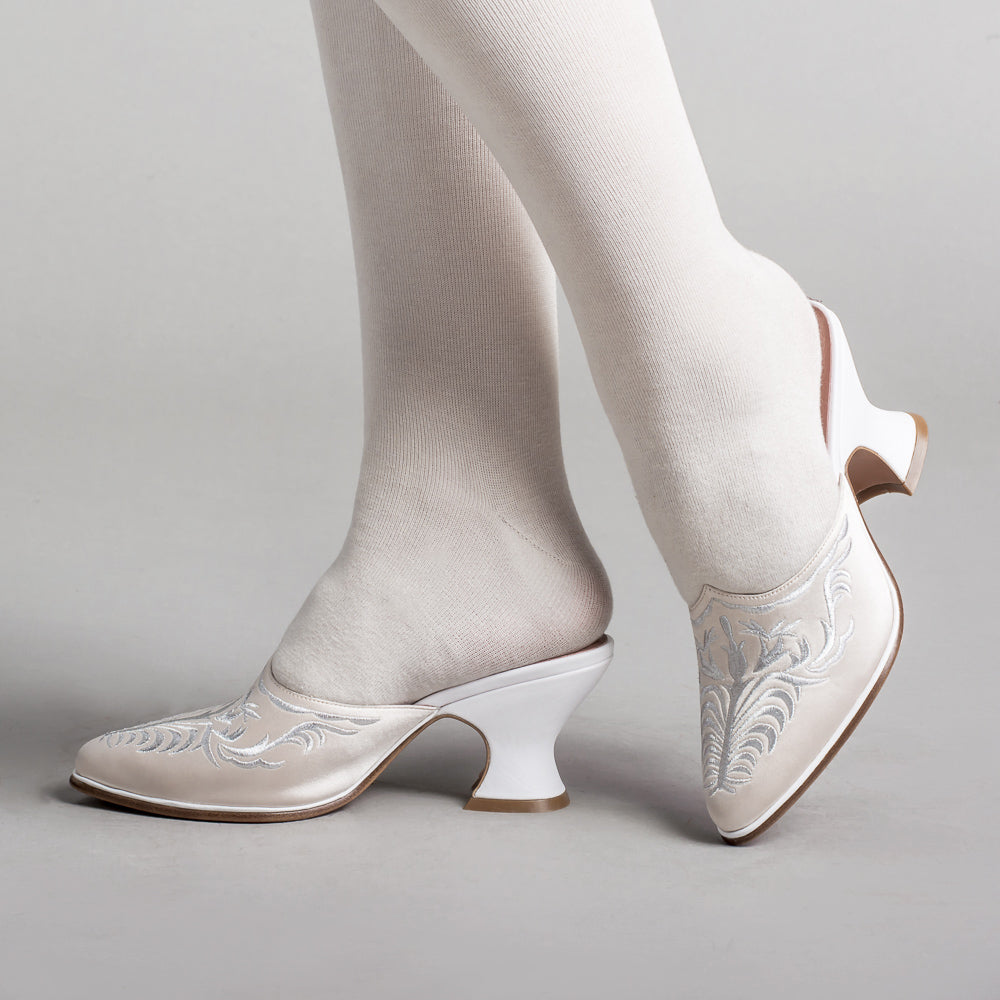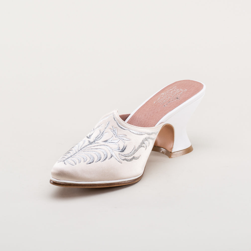 Antoinette 18th century mules present a gorgeous opulence in fancy footwear for your Georgian era impressions. Correct for c. 1700 - 1770s, these elegant backless heeled slippers are the ideal choice for fancy gowns fit for Versailles, with a superbly balanced French heel, leather lining for easy walking, and a softly pointed toe.