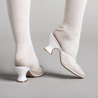 - Well-balanced, custom 2.5 in / 6.3 cm leather-covered French heels