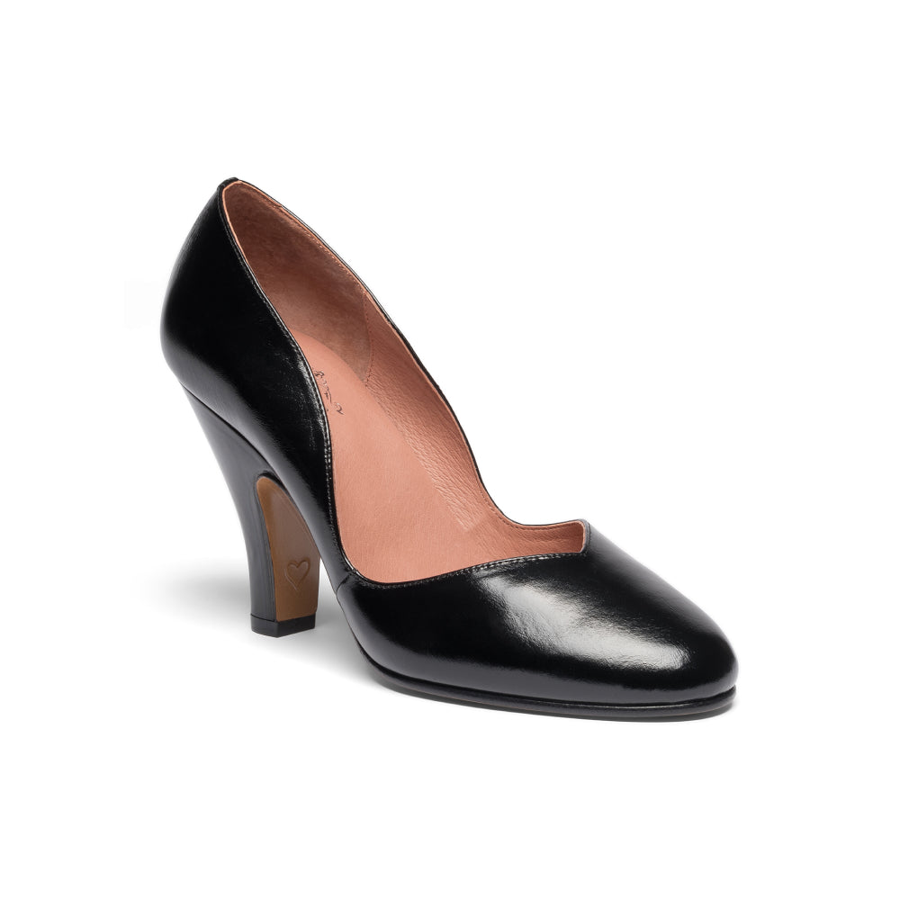 Meet Ginger, a seductive vintage pump that will set your heart aflutter! Marilyn's sophisticated cousin, Ginger is a shapely shoe that features deep, swooping curves that flatter the foot. The breast of Ginger's custom, 3.5" 8.9 cm Spanish heel is decorated with a darling debossed heart. Adorable heart-shaped shoe clips are easy to apply and remove, for added versatility. Pair Ginger with your favorite 1940s and 1950s ensembles, or with your contemporary wardrobe. This definitively fashionable shoe goes with anything and everything, from dresses to trousers, and fluffy petticoats to wiggle skirts.