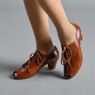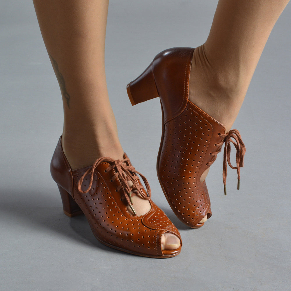 Jenny sports a decorative keyhole opening over the vamp, and a small peep-toe peeking through overlapping leather detailing over the toe. The perforated smooth leather vamp allows for breathability through all seasons. Stable, leather-wrapped 2.5”/5.7 cm Cuban heels will keep feet comfortable for hours of wear. Matching laces lace through hidden eyelets, complimenting the eye-catching colors of the leather.