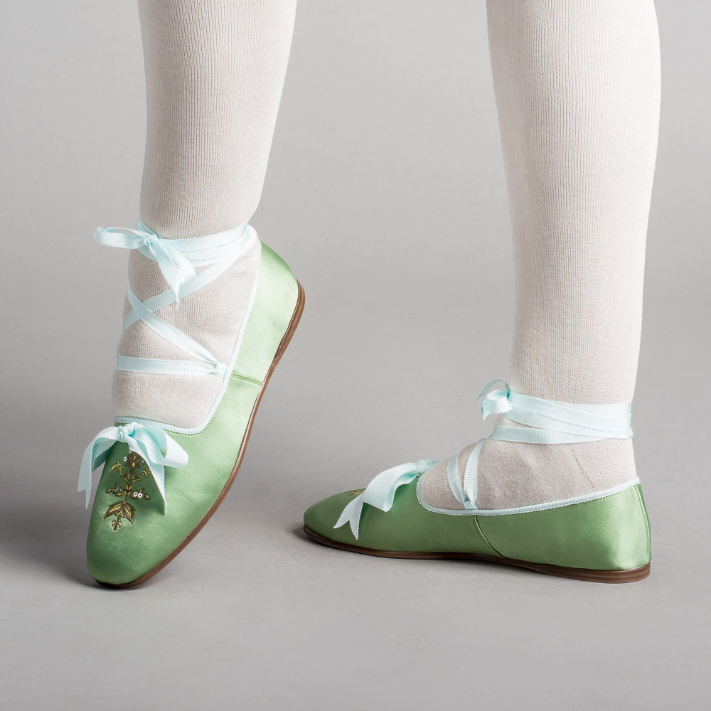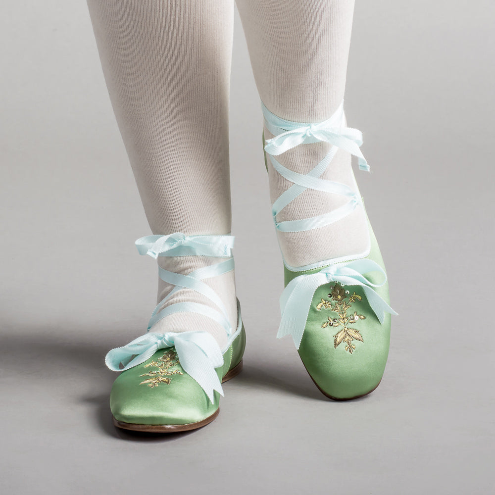 Bring your Regency dreams to life with the perfect pair of delicate dancing slippers. The Penelope slippers offer beauty, comfort, and versatility with so many color pairings, ways to wear the ribbons, and a soft yet durable construction.