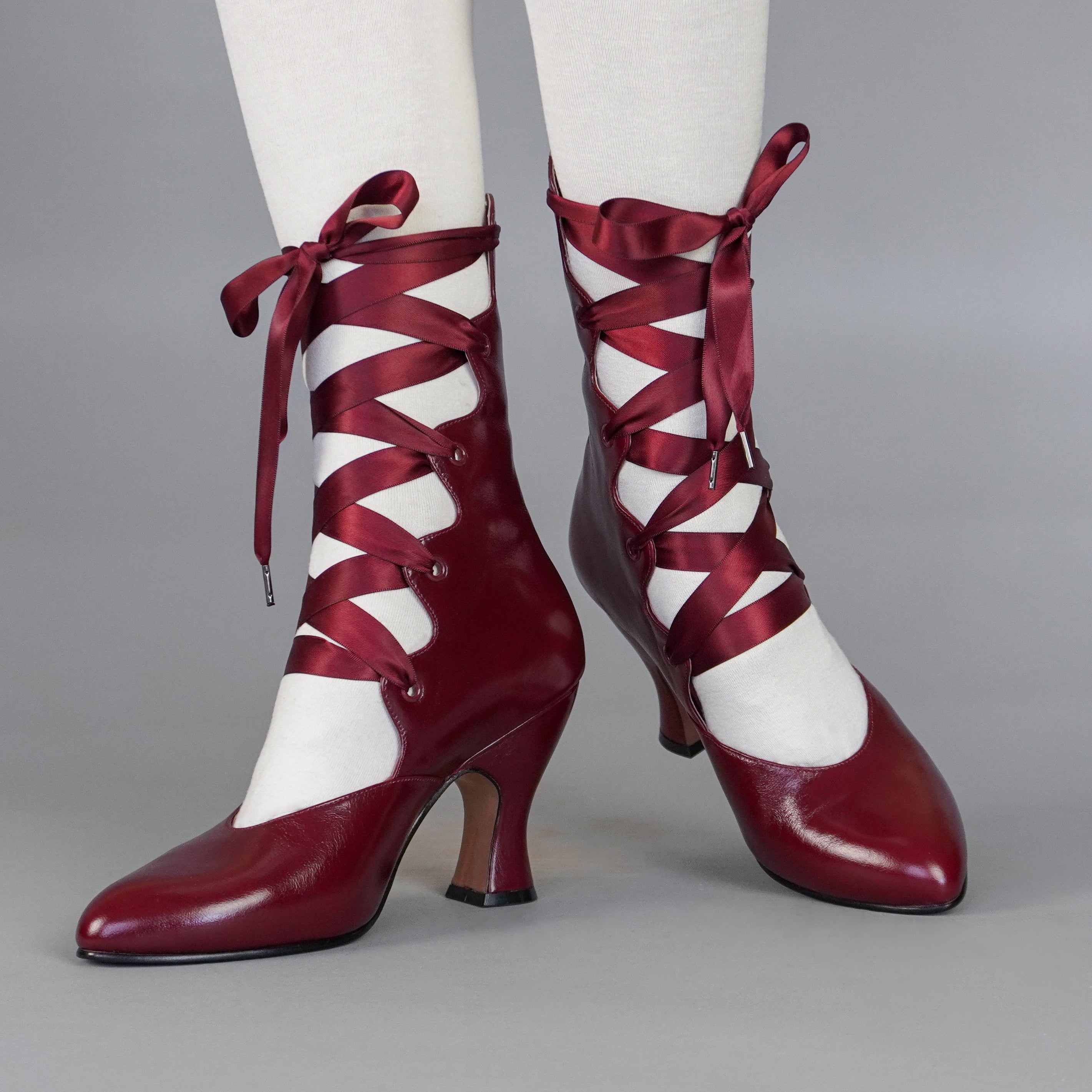 Tango Edwardian Boots are just as seductive as the Tango dance craze that swept the world in the 1910s. Designed to show off the legs, these gorgeous lace-up boots are based on several antique examples from 1900 through 1920. Tango features a deliciously curved shaft and scalloped tabs, which are laced with double-faced satin ribbon laces. Tango comes with two sets of ribbon laces, for adjustable sizing. Smooth leather uppers are stunning in a variety of beautiful colors. Tango sports a brand-new, custom 3.5 inch/ 8.9 cm French heel- our highest heel yet! Tango's heel is just as curvy and sumptuous as it is well-balanced, so you can dance the night away.