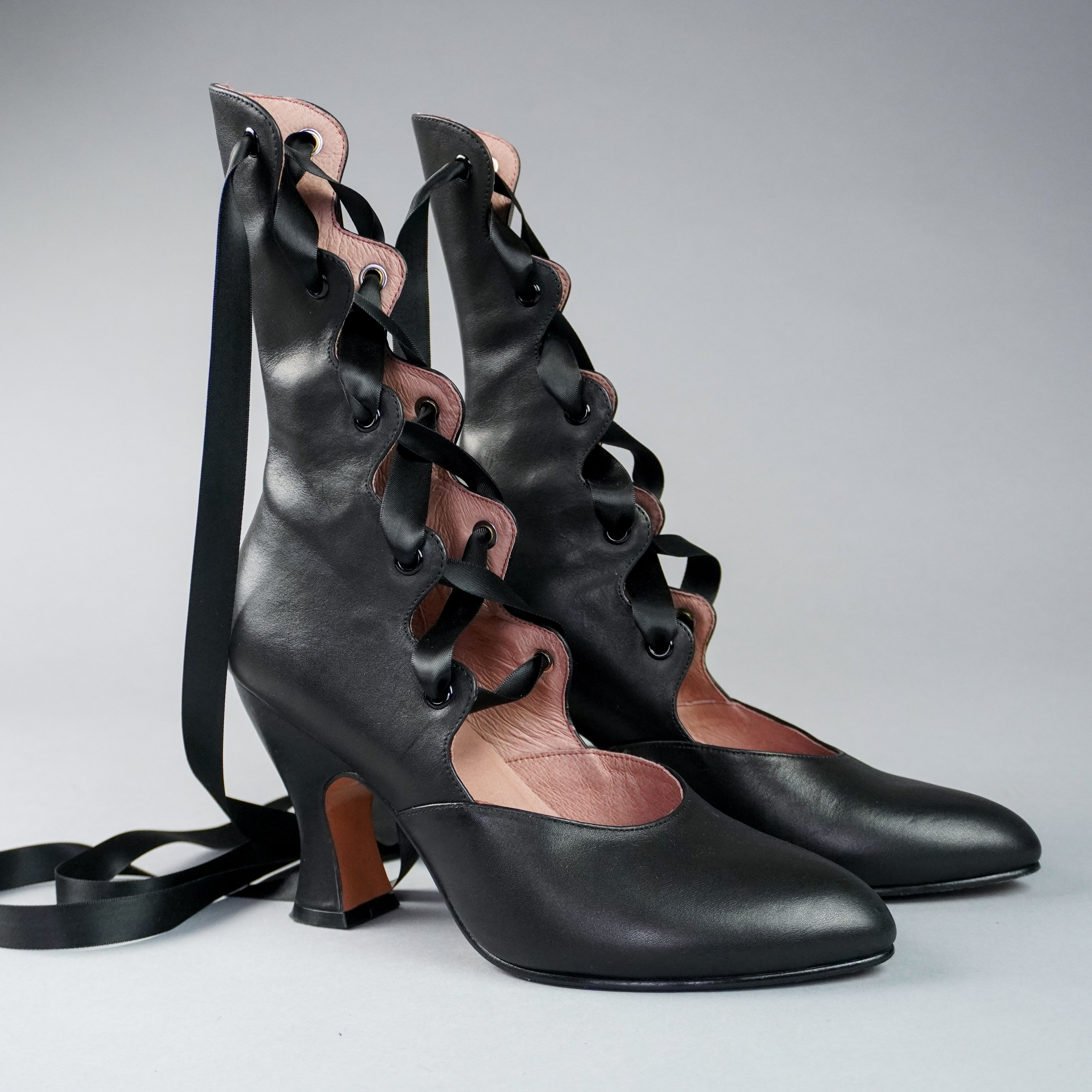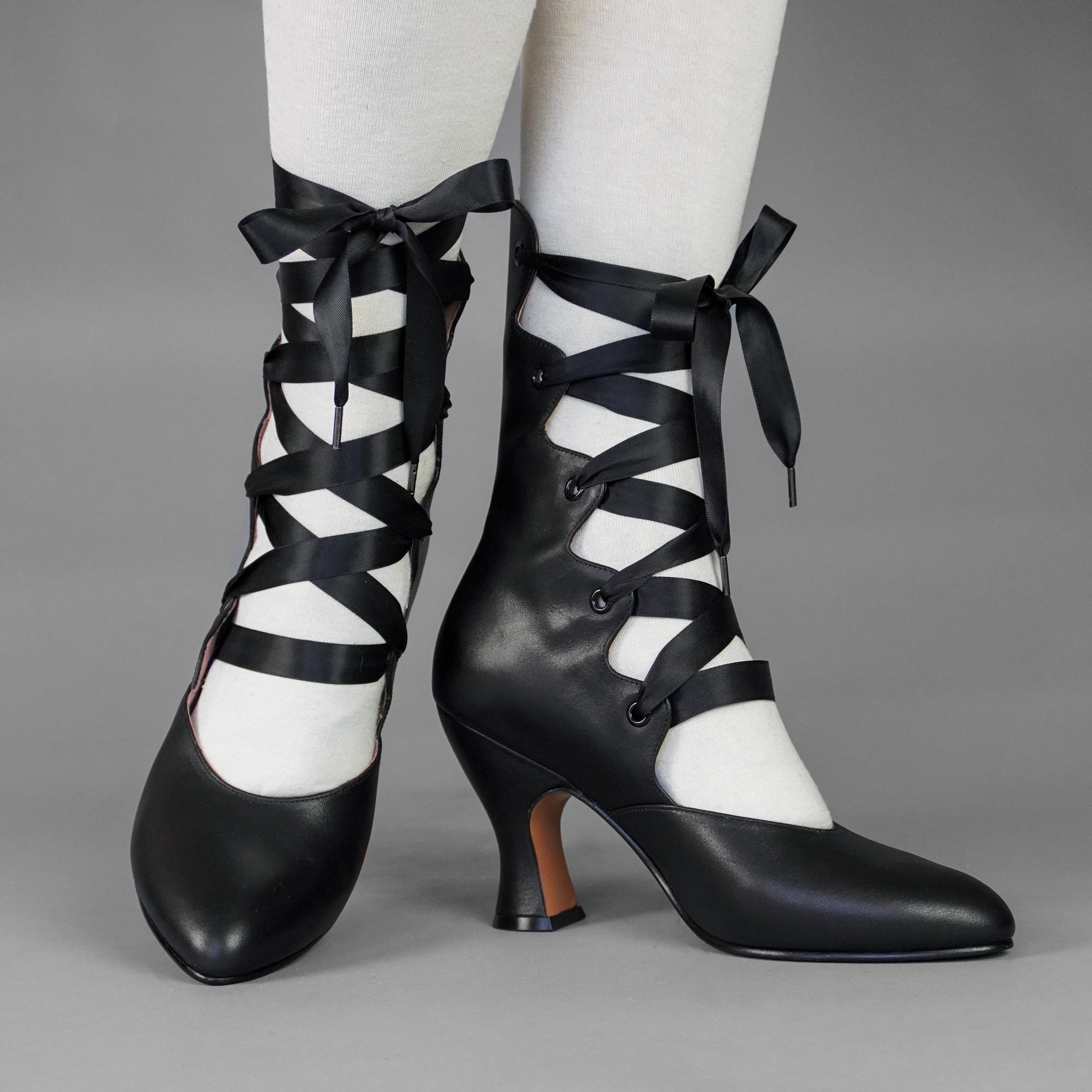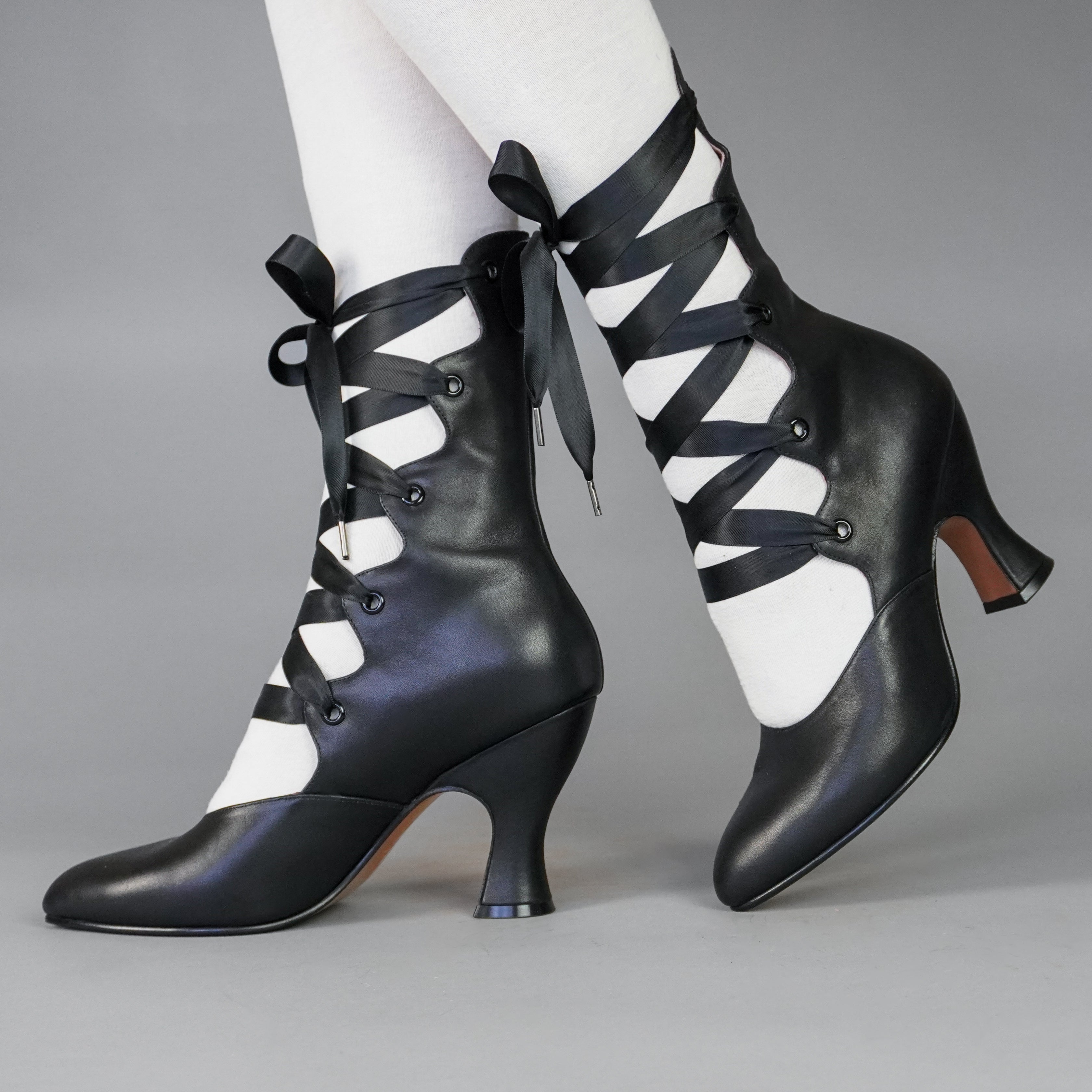 Tango Edwardian Boots are just as seductive as the Tango dance craze that swept the world in the 1910s. Designed to show off the legs, these gorgeous lace-up boots are based on several antique examples from 1900 through 1920. Tango features a deliciously curved shaft and scalloped tabs, which are laced with double-faced satin ribbon laces. Tango comes with two sets of ribbon laces, for adjustable sizing. Smooth leather uppers are stunning in a variety of beautiful colors. Tango sports a brand-new, custom 3.5 inch/ 8.9 cm French heel- our highest heel yet! Tango's heel is just as curvy and sumptuous as it is well-balanced, so you can dance the night away.