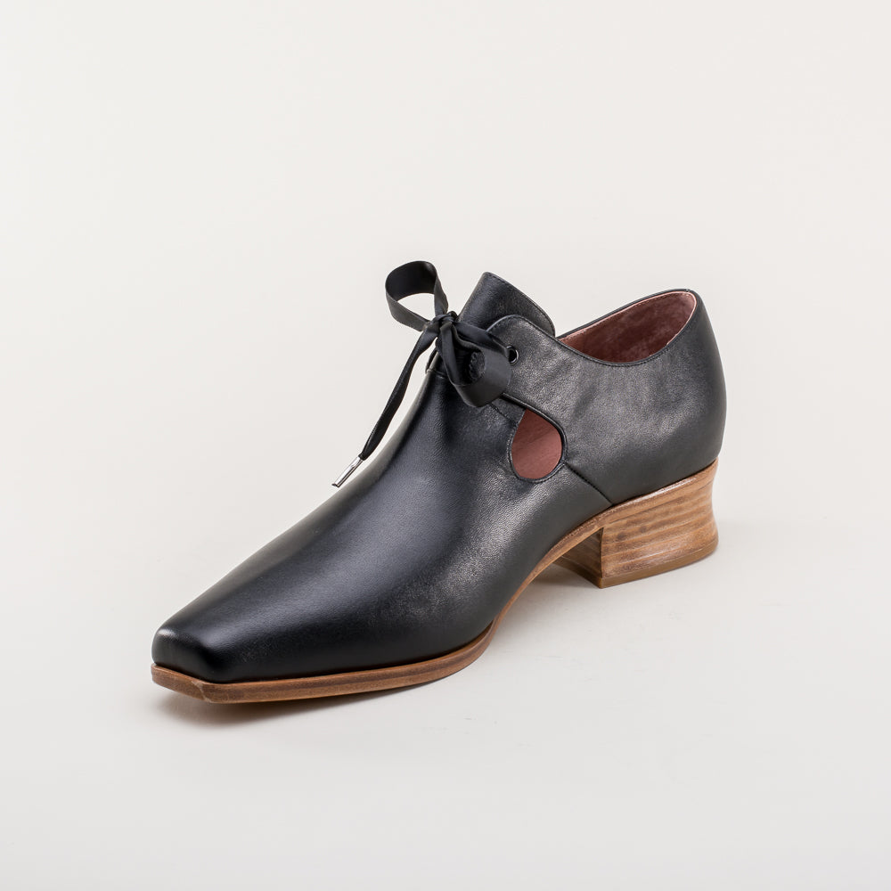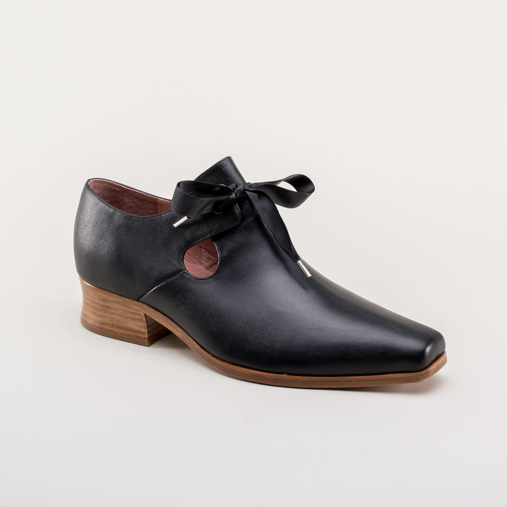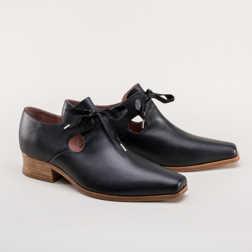 Named for King Louis XIV of France, these wonderful 17th century shoes offer unique tapered square toes and gently shaped heel on a very sturdy leather sole. The adjustable latchet closure ties with a satin ribbon, but don't be afraid to add rosettes or other decoration for a very Baroque vibe.