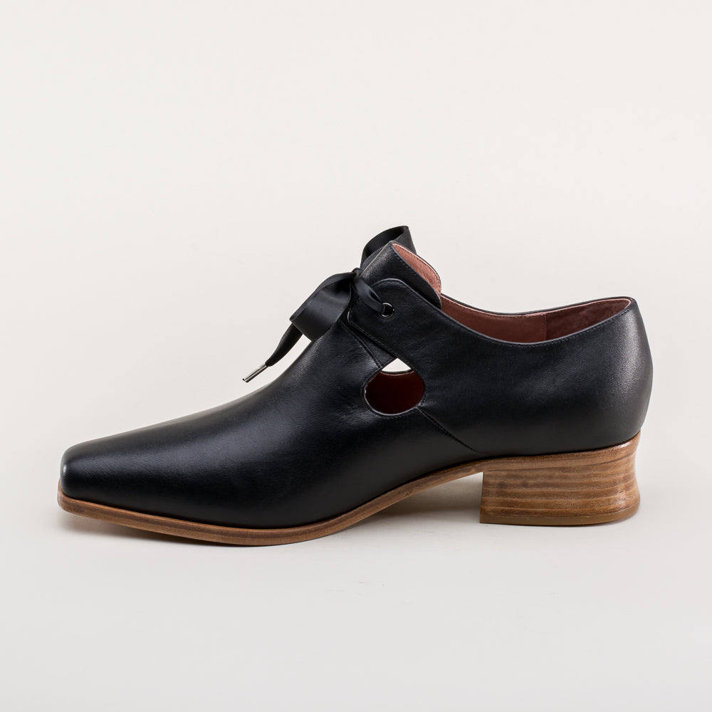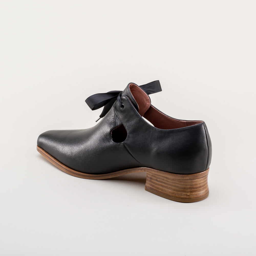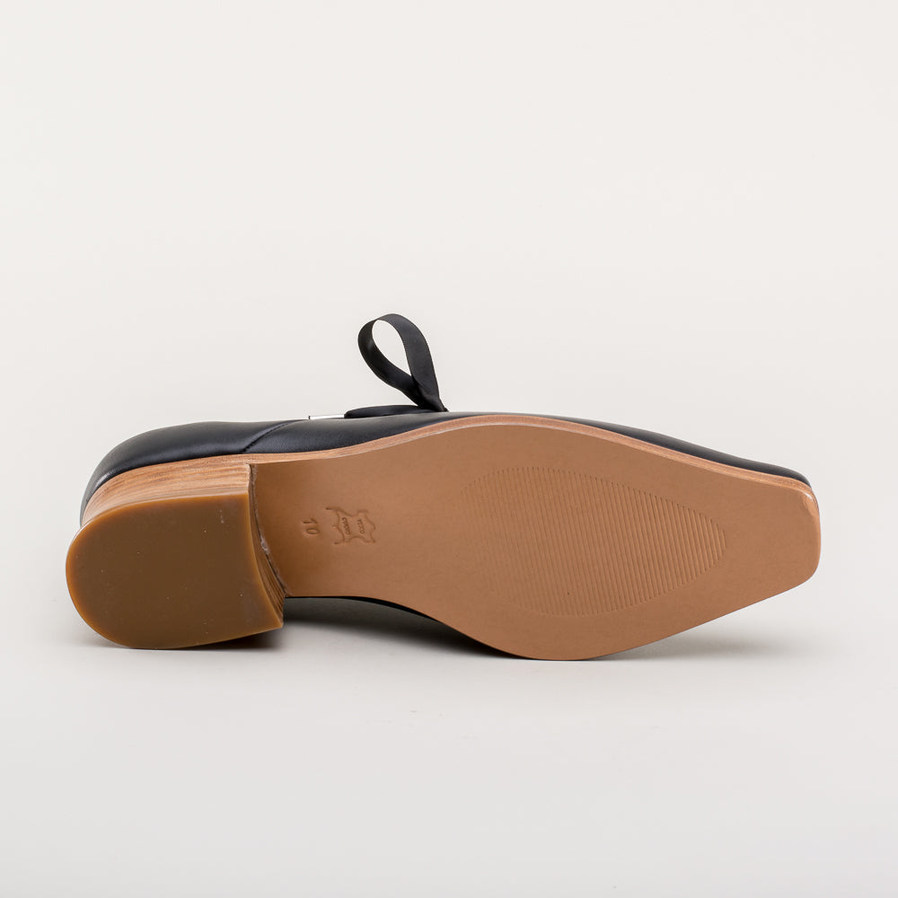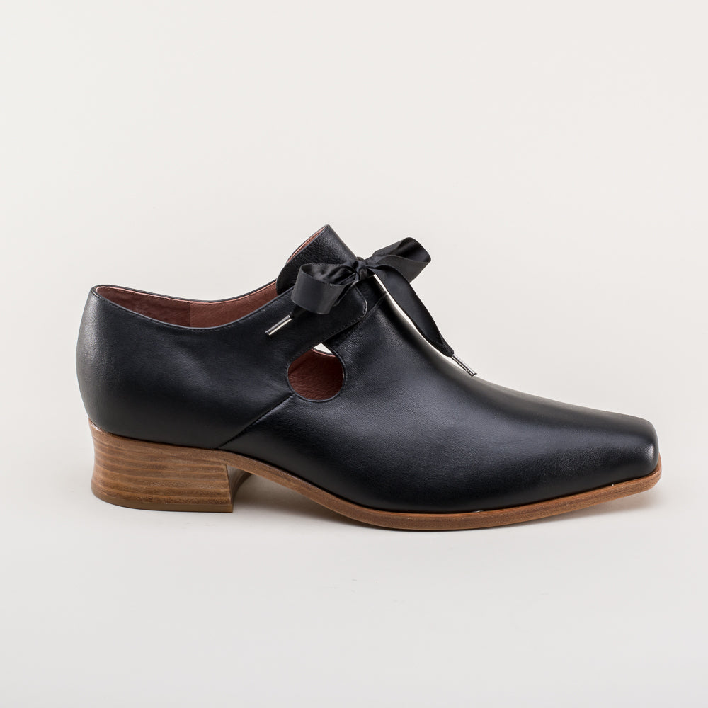 Named for King Louis XIV of France, these wonderful 17th century shoes offer unique tapered square toes and gently shaped heel on a very sturdy leather sole. The adjustable latchet closure ties with a satin ribbon, but don't be afraid to add rosettes or other decoration for a very Baroque vibe.