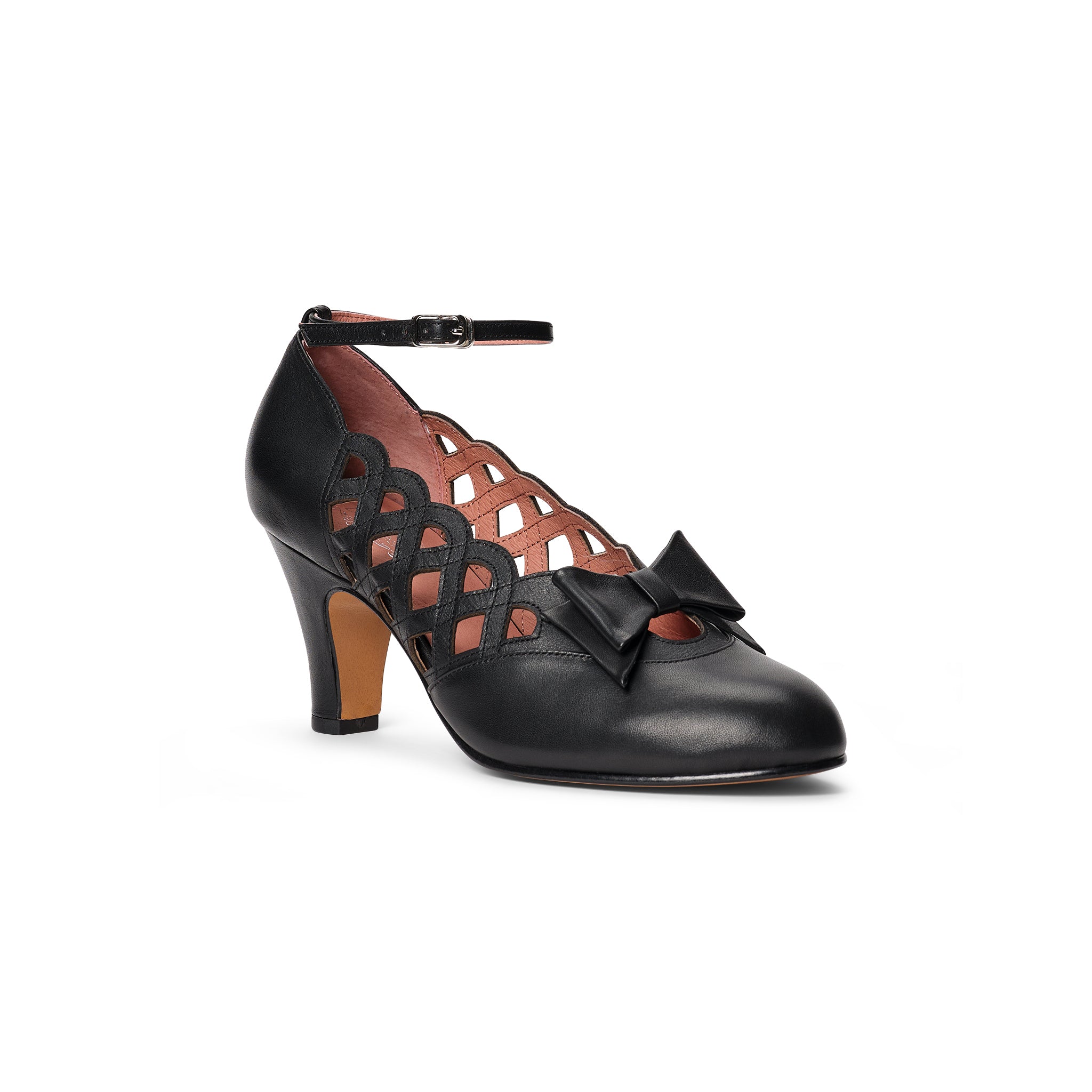 Meet Jessie, designed in collaboration with YouTuber Jessica Kellgren-Fozard from Jessica Out of the Closet! Based on original shoes from the 1940s, Jessie Pumps feature attractive lattice cut-outs, beautiful scalloped edges, and a decorative leather bow. Each pair of Jessies come with two removable leather ankle straps, to suit a wide variety of ankle sizes. Simply thread the strap through the tab on the back of the heel and fasten the quick-release buckle for days when you need some extra security, or just want to change up your look! Hidden elastic under the bow makes these step-in pumps easier to put on and remove. A rounded toe box and beautiful 3”/7.62 cm Spanish heel make Jessie perfect for 1940s-1950s ensembles.