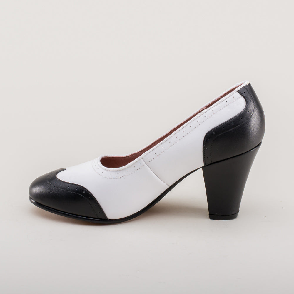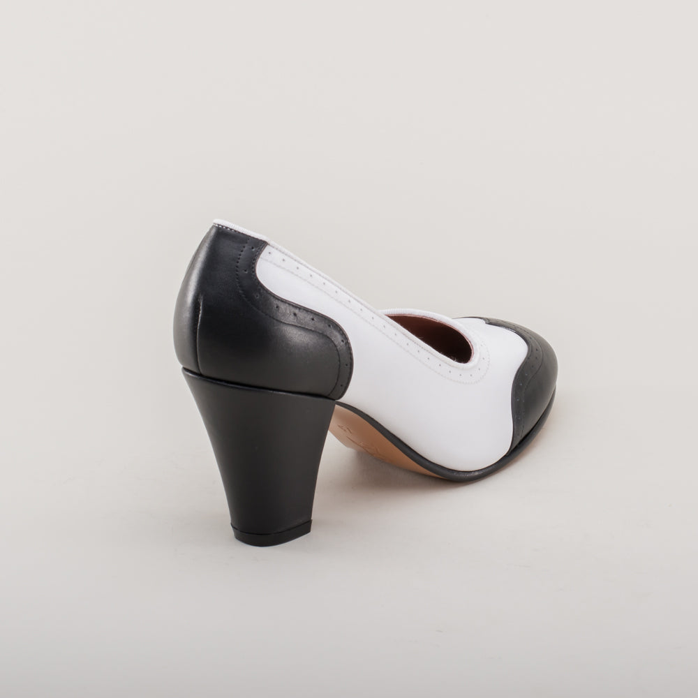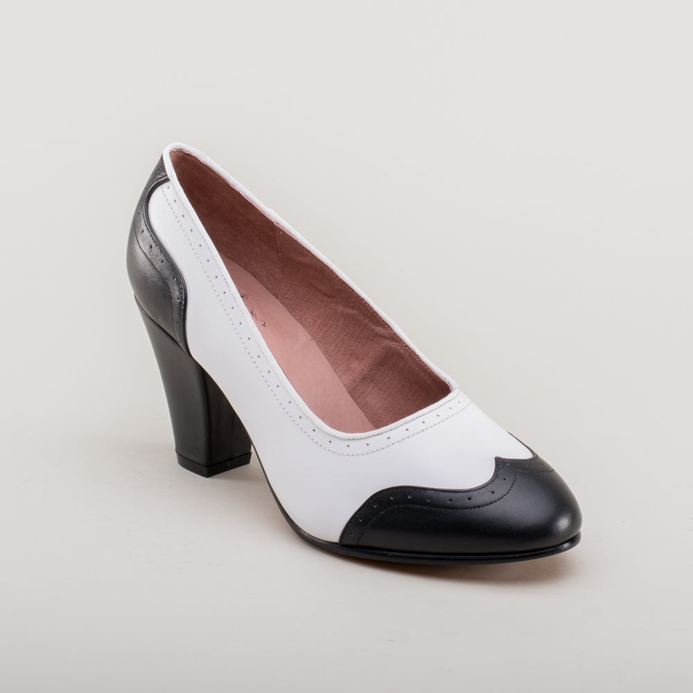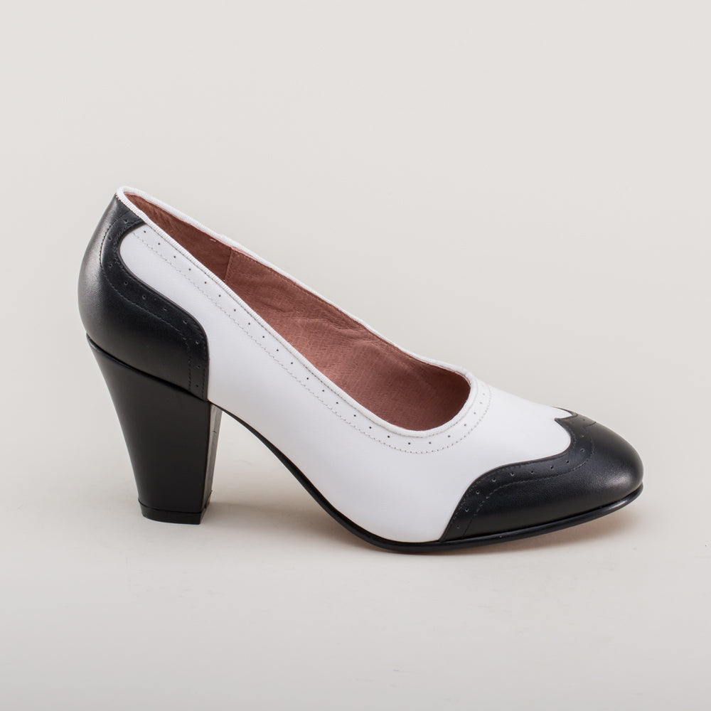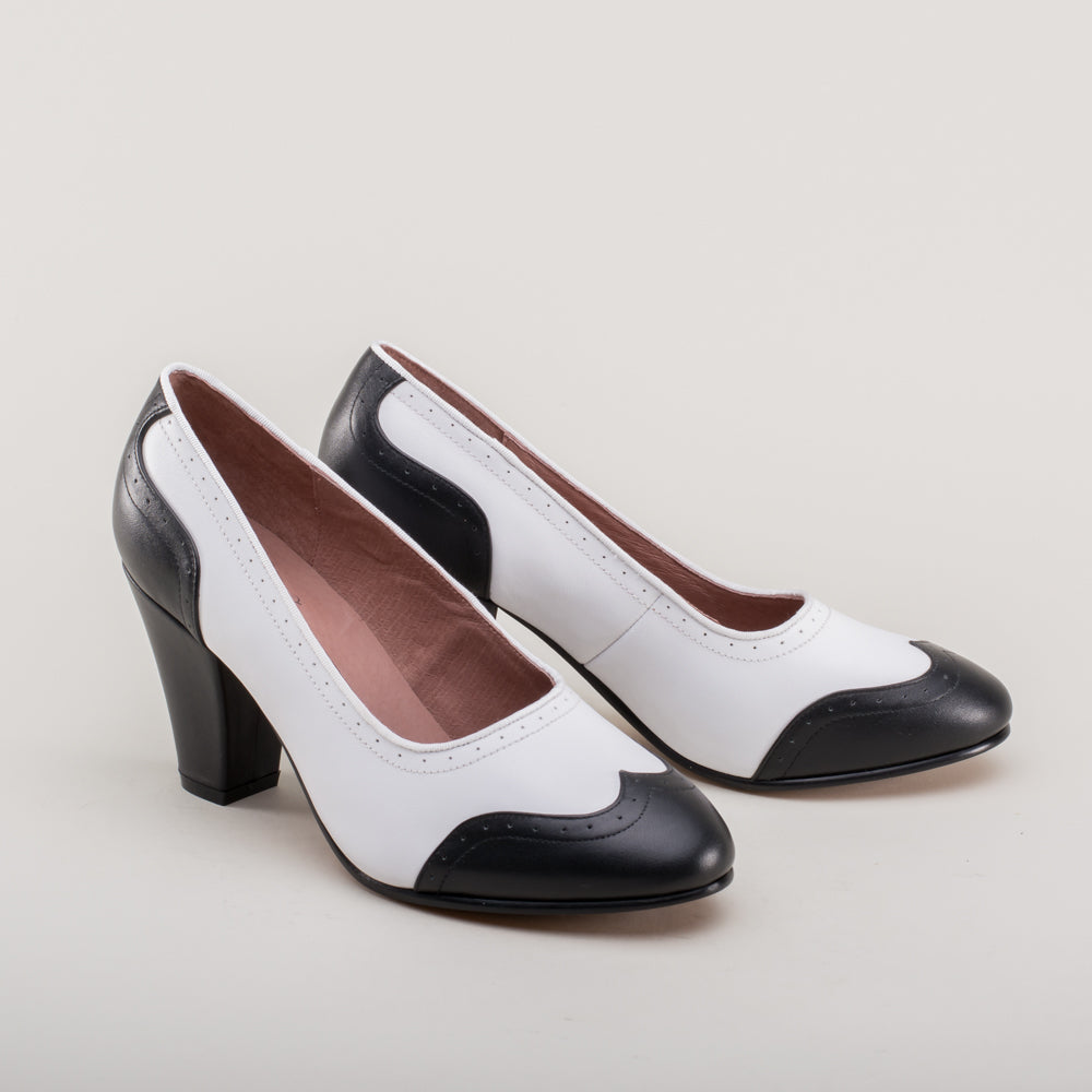 Peggy 1940s Spectator Pumps are quintessentially 1940s. Designed from original vintage shoes, the all-leather Peggy features wingtip styling with subtle broguing in rich black and bright white, with a high vamp, round toe, and three inch '40s cuban heel.