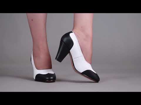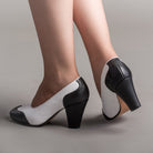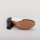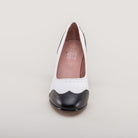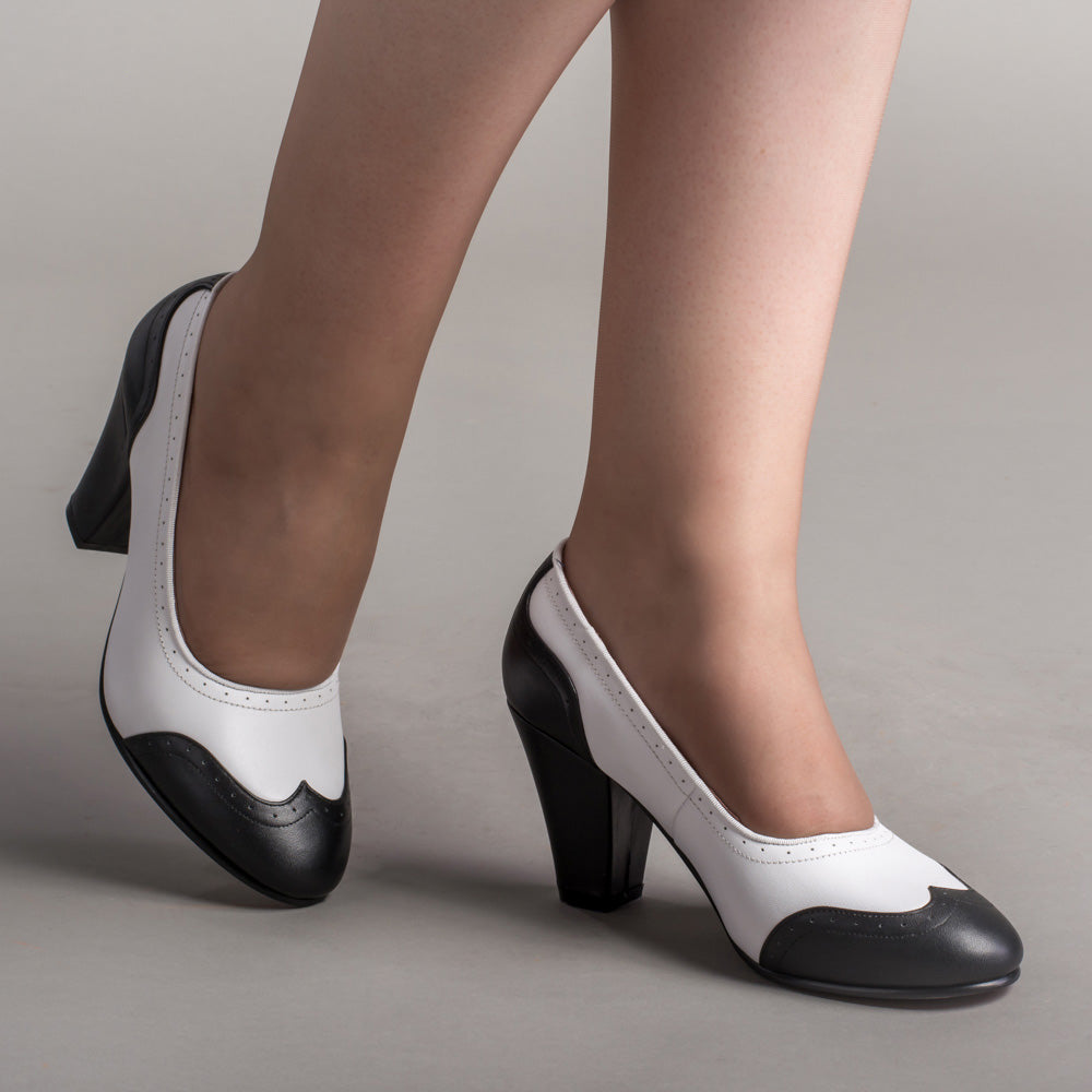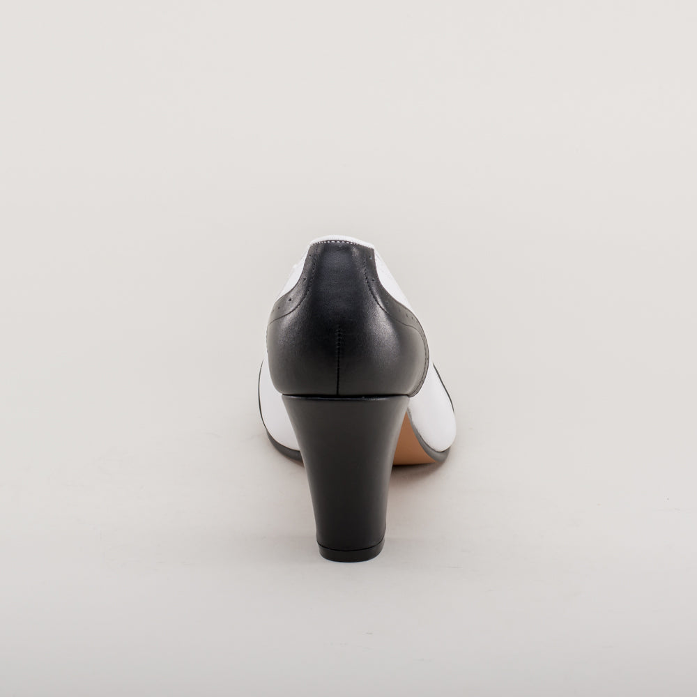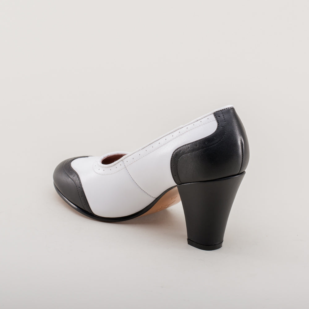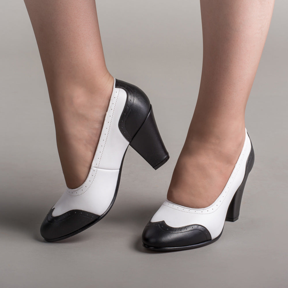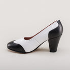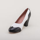 Peggy 1940s Spectator Pumps are quintessentially 1940s. Designed from original vintage shoes, the all-leather Peggy features wingtip styling with subtle broguing in rich black and bright white, with a high vamp, round toe, and three inch '40s cuban heel.