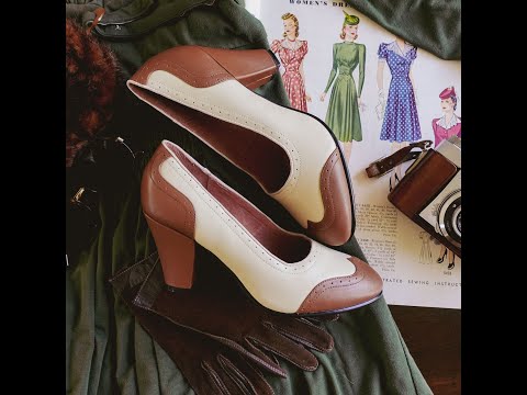 Peggy 1940s Spectator Pumps are quintessentially 1940s. Designed from original vintage shoes, the all-leather Peggy features wingtip styling with subtle broguing with a high vamp, round toe, and three inch '40s cuban heel.