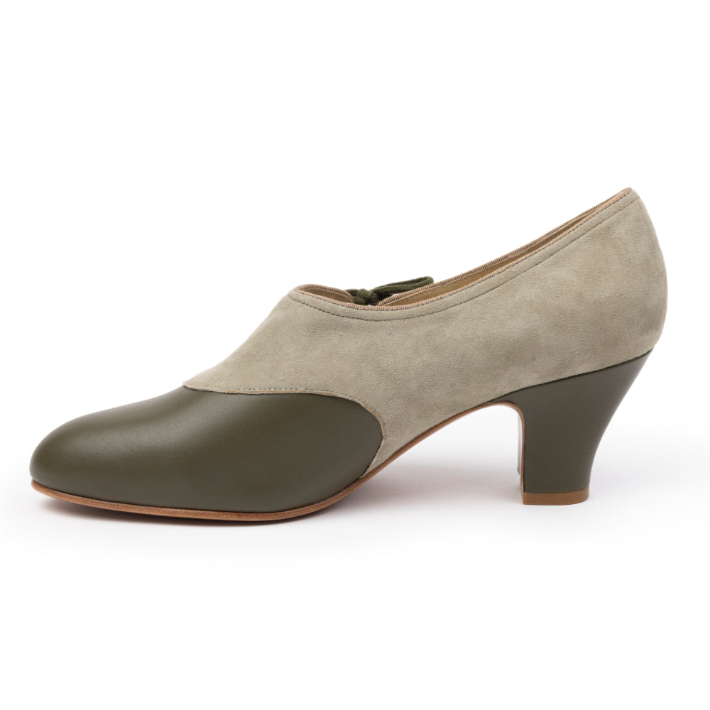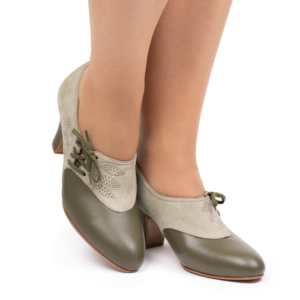 Stop traffic with Madison! Based on an original 1930s pair, these smart and stylish shoes are crafted from suede and smooth leather in coordinated shades. The uppers feature detailed decorative stitching framing a pattern of fine perforations. 2.5"/6.35 Spanish heels are perfectly balanced, for all-day comfort. Madison's chic side closures lace up with matching cotton laces, making for an utterly charming vintage look.
